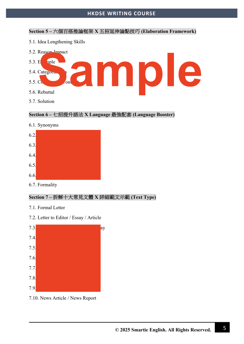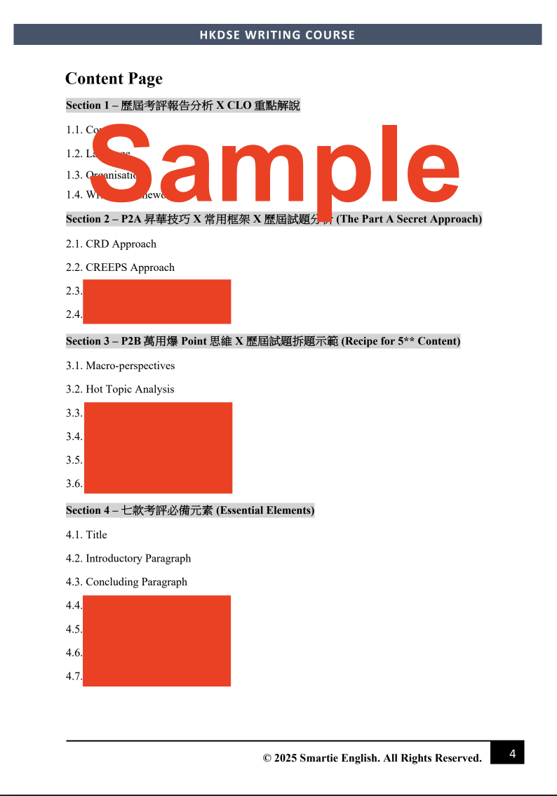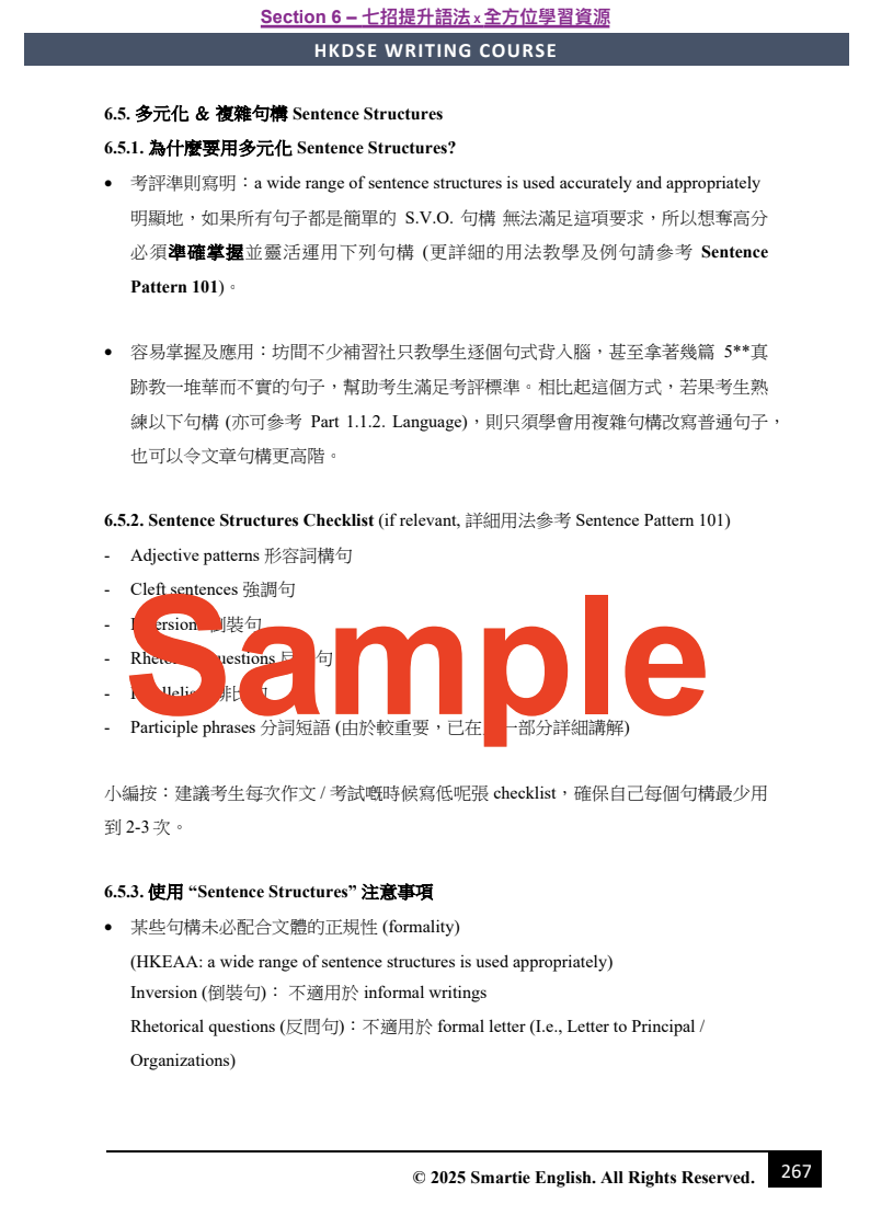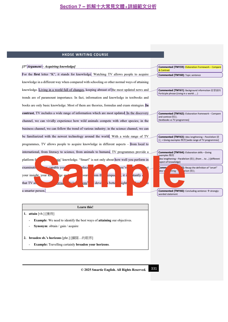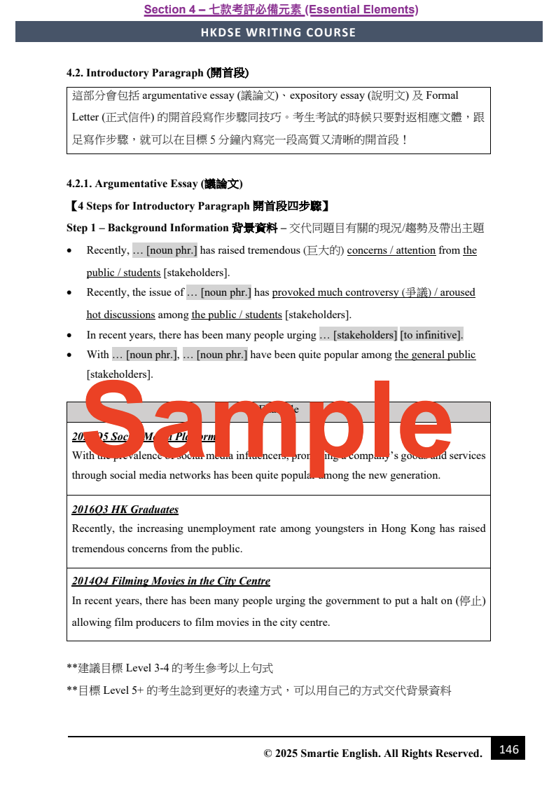 Smartie教學特色之一:「有得背就唔好嘥時間諗」。呢部分會教你七招寫出吸精title、公式化首尾段、萬用主題句及小結句、以及提供奪星必備高階連接詞庫(連中文解釋、例句!) 背定曬七款考評必備元素嘅5**級罐頭句,慳返時間之餘,係最容易嘅部分搶盡印象分!
