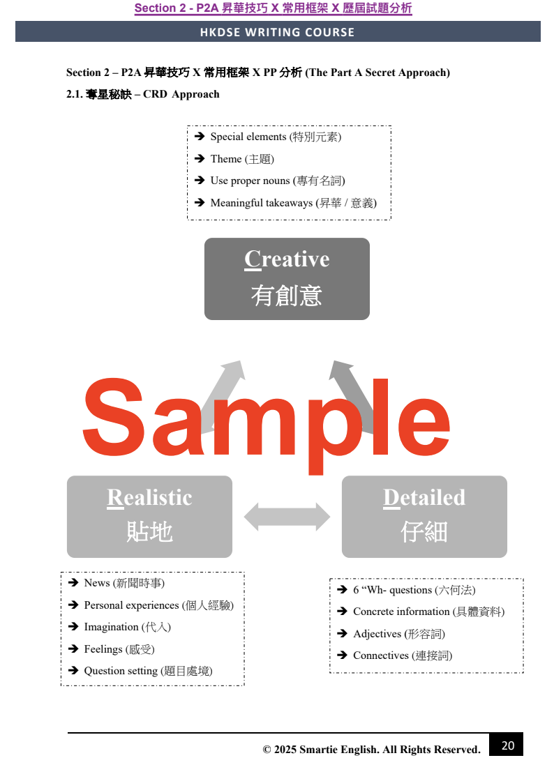 卷二Part A嘅short task題型多變、看似難以捉摸,令唔少考生失分 (唔好唔記得Part A 佔成分卷二嘅40%!) 呢部分將針對Part A,教授獨家秘訣 “CRD ” 、昇華技巧 “CREEP” 及short task寫作框架,配合10條歷屆試題分析,讓你輕鬆寫好short task。