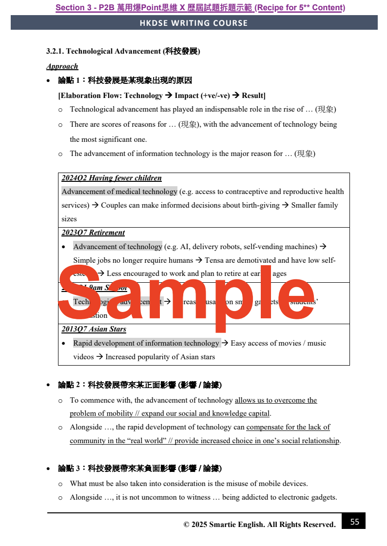 好多同學寫完topic sentence就開始唔知點作落去,呢度將會充分呈現比你睇點樣將elaboration「公式化」。喺呢部分,我會教你六個百搭推論框架,配合五招延伸論點技巧,你會知道做到高階嘅推論比你想象中簡單得多,皇牌筆記更加提供咗合共50個示範段落比你參考,只要上足堂、溫足筆記,你一樣可以輕鬆做好推論。