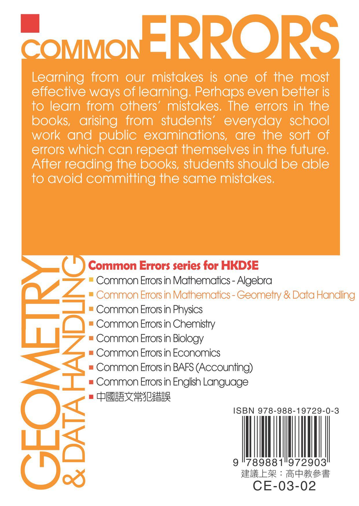 - 從錯誤中學習為學習的其中一個有效途徑,而從他人之錯誤中學習亦能令自己獲益。書中以典型的例子及簡潔清晰的解說,列舉學生在學校習作、公開考試中經常重犯的錯誤。閱畢此列系叢書,同學將能引以為鑑,避免重蹈覆轍。