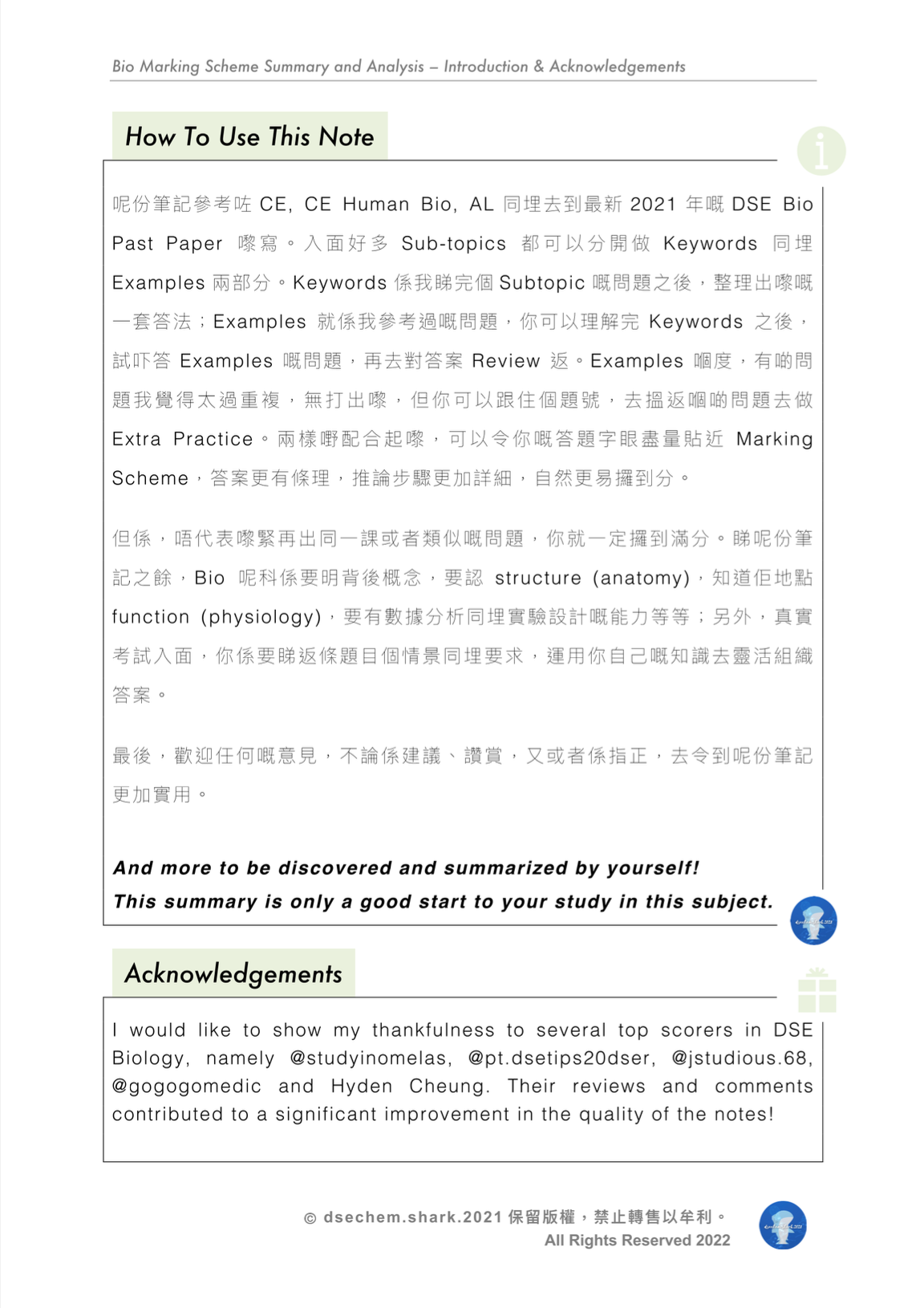 可以完成到呢份筆記,要多謝返幾位 5*/5** bio top scorers 幫手,有 study-gram、師兄、同學同埋朋友🤣,無條件咁樣幫我 review 🙇🏻‍♂️🙇🏻‍♂️,我 adopt 咗好多佢地嘅意見,令到份 notes 對於考 DSE 嚟講更加穩陣同埋實用🤓