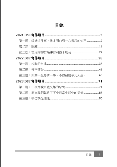 本書收錄42篇寫作範文,涵蓋 2012-2025 DSE 中文作文題目,包括:
