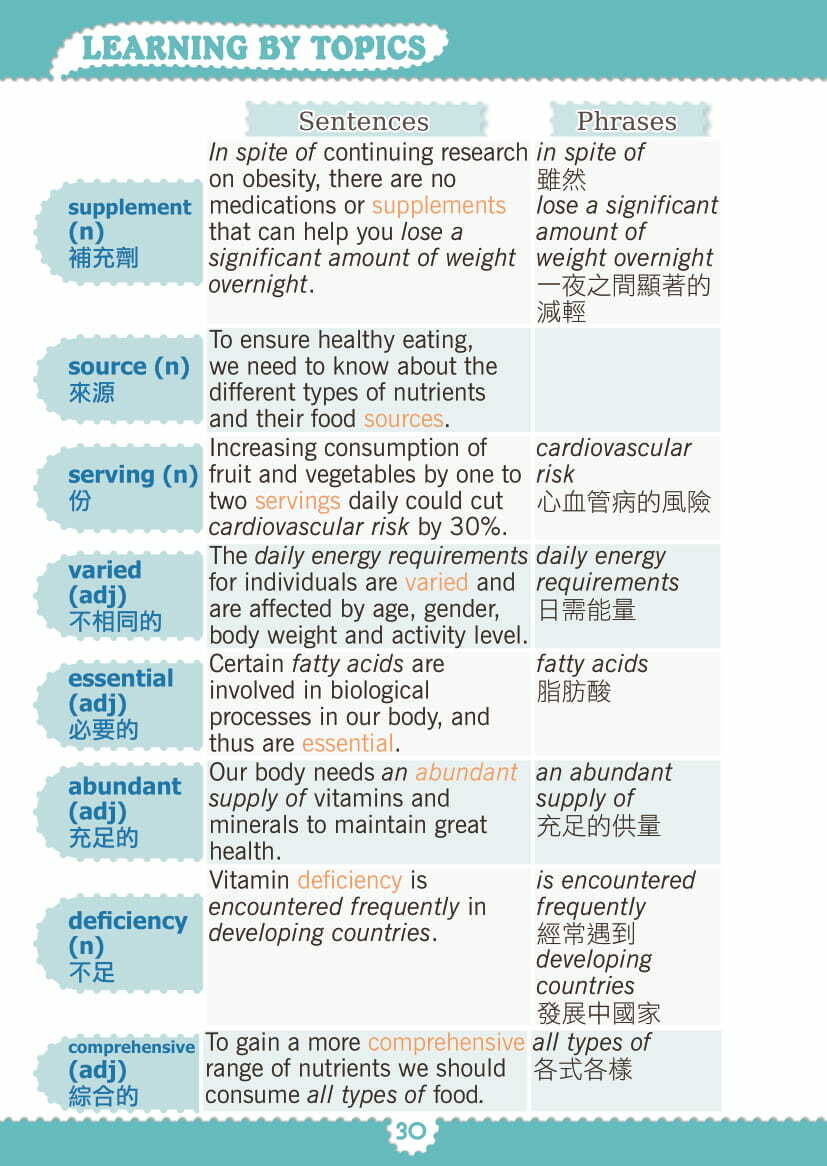 - 豐富的例子輔以中文翻譯詳細解說詞彙在實際語境的用法,有助加深印象