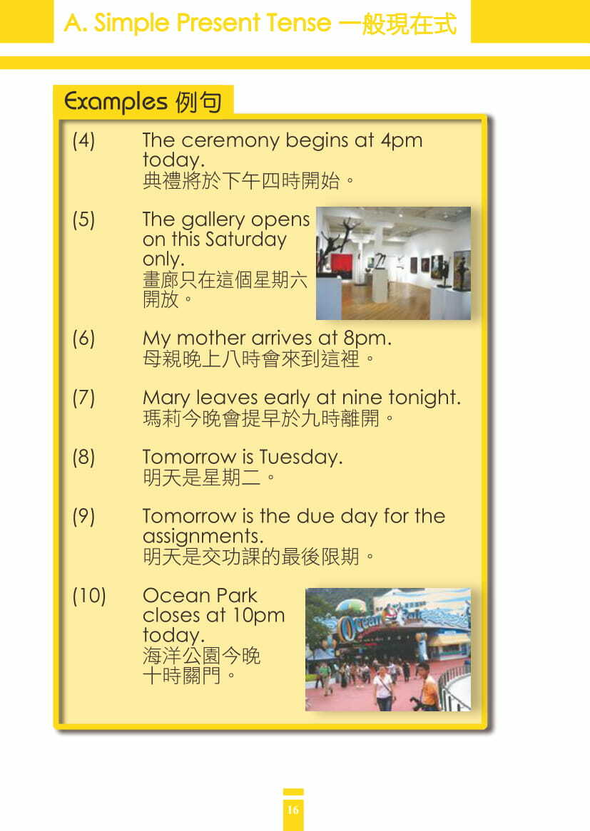 - 編排分明,涵蓋12種時態——「一般現在式」(Simple Present Tense)、「現在進行式」(Present Continuous Tense)、「一般過去式」(Simple Past Tense)、「過去進行式」(Past Continuous Tense)、「一般將來式」(Simple Future Tense)、「將來進行式」(Future Continuous Tense)、「現在完成式」(Present Perfect Tense)、「過去完成式」(Past Perfect Tense)、「現在完成進行式」(Present Perfect Continuous Tense)、「過去完成進行式」(Past Perfect Continuous Tense)、「將來完成式」(Future Perfect Tense) 及「將來完成進行式」(Future Perfect Continuous Tense)