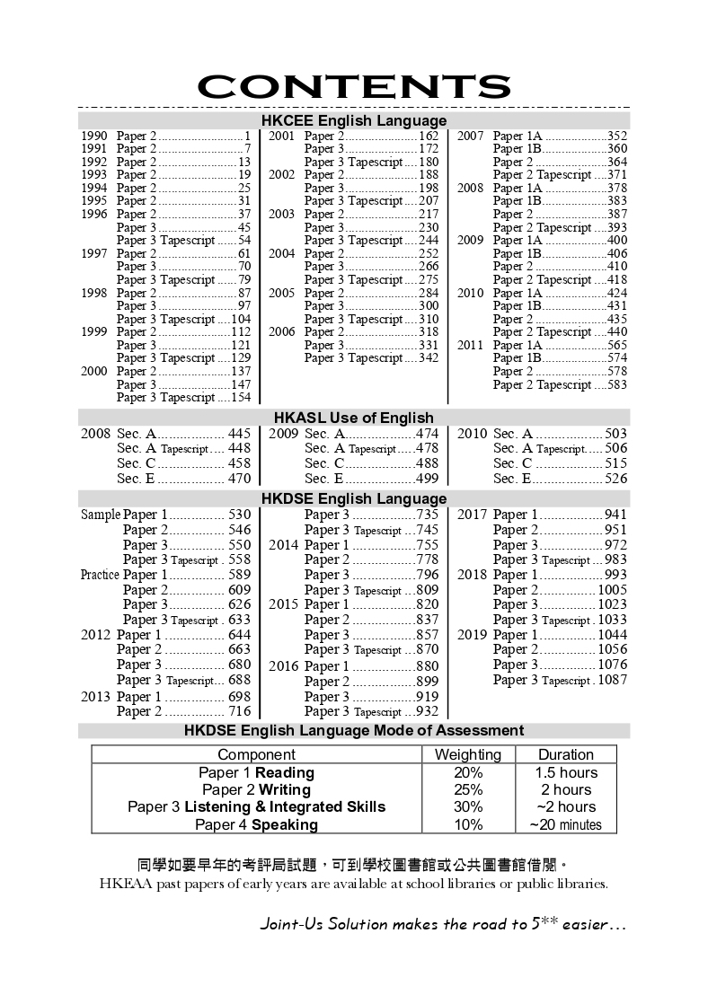 本書並無收錄試題。近年的試題可於考評局購買,早年的試題則可於學校圖書館或公共圖書館借閱。