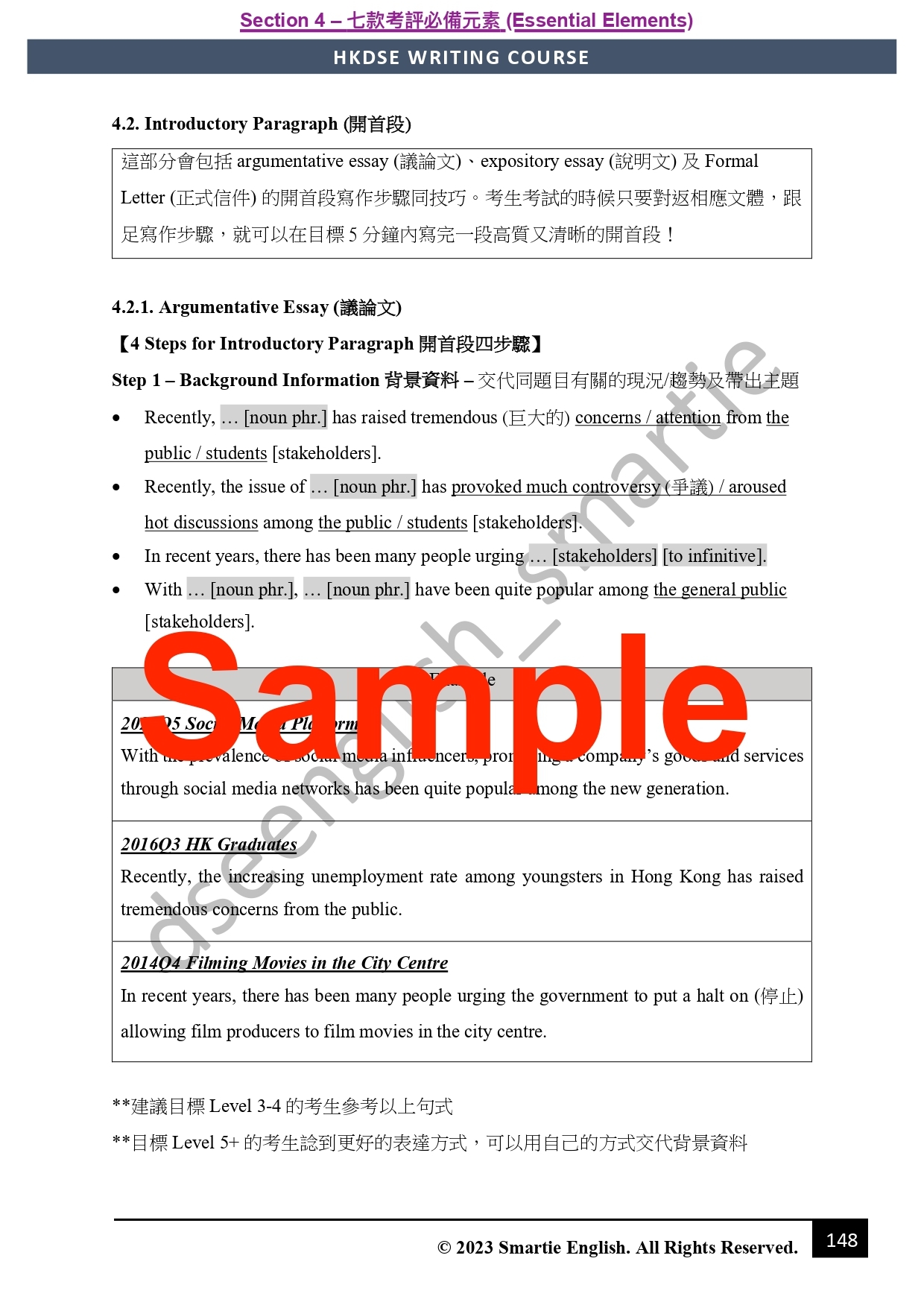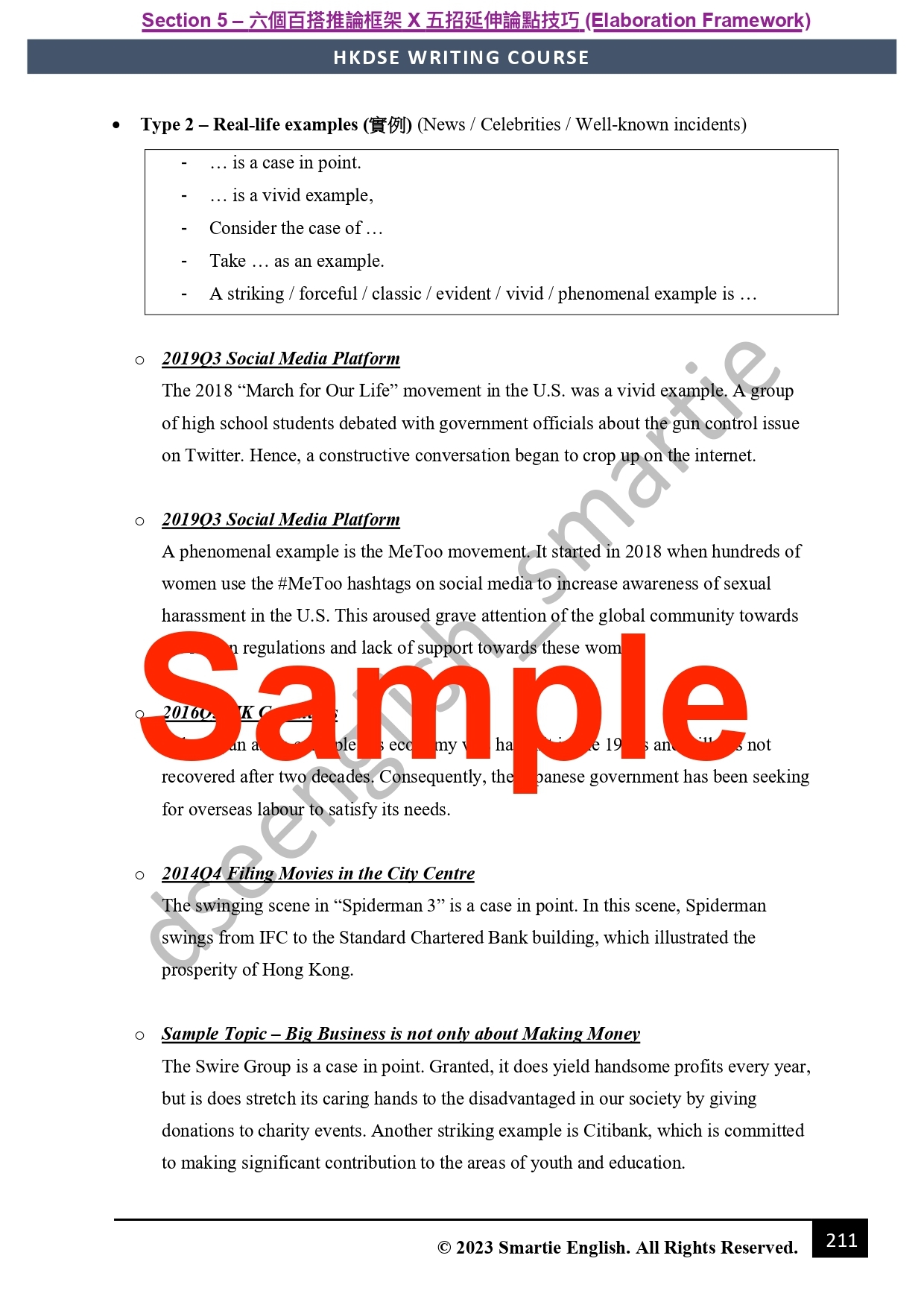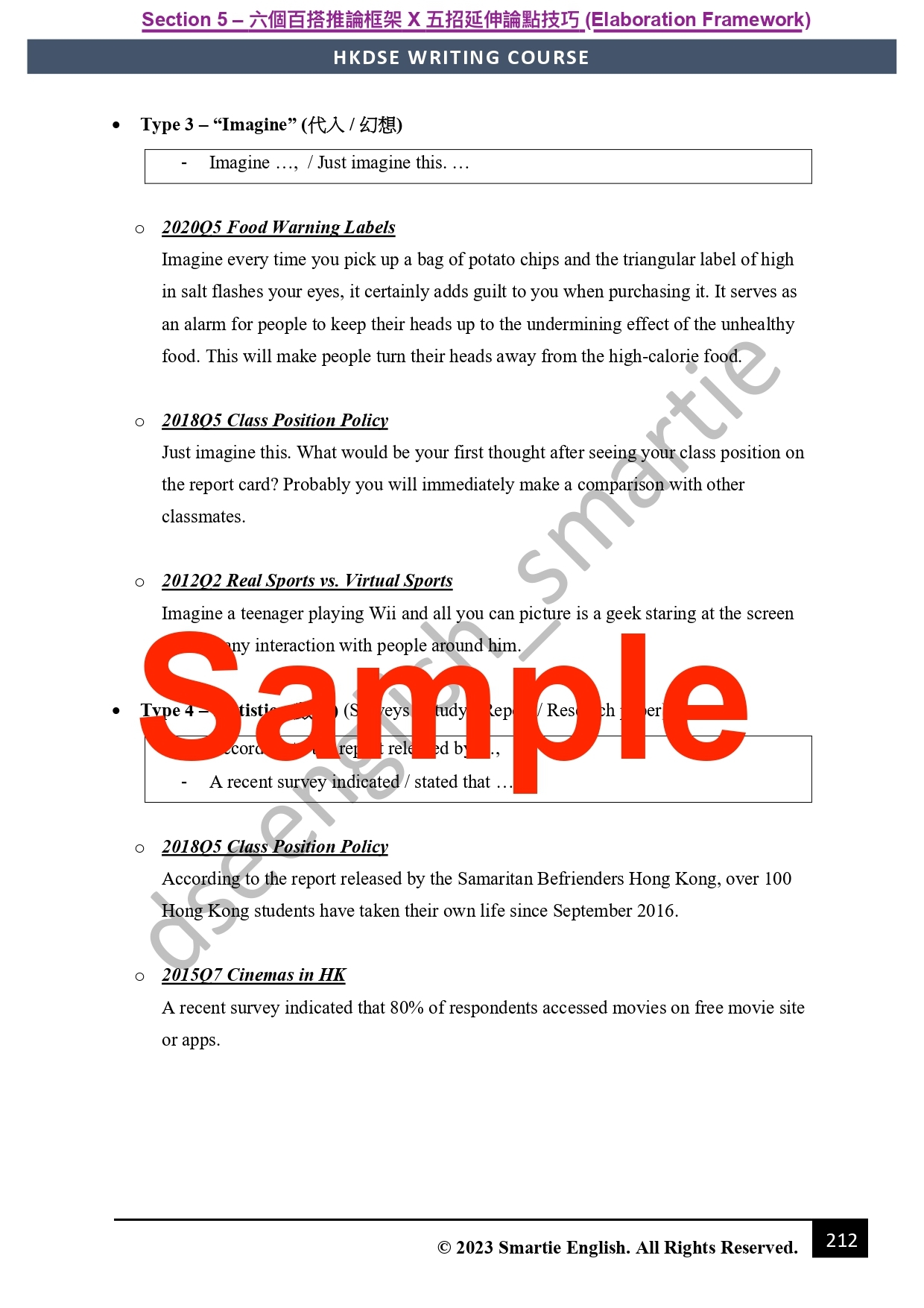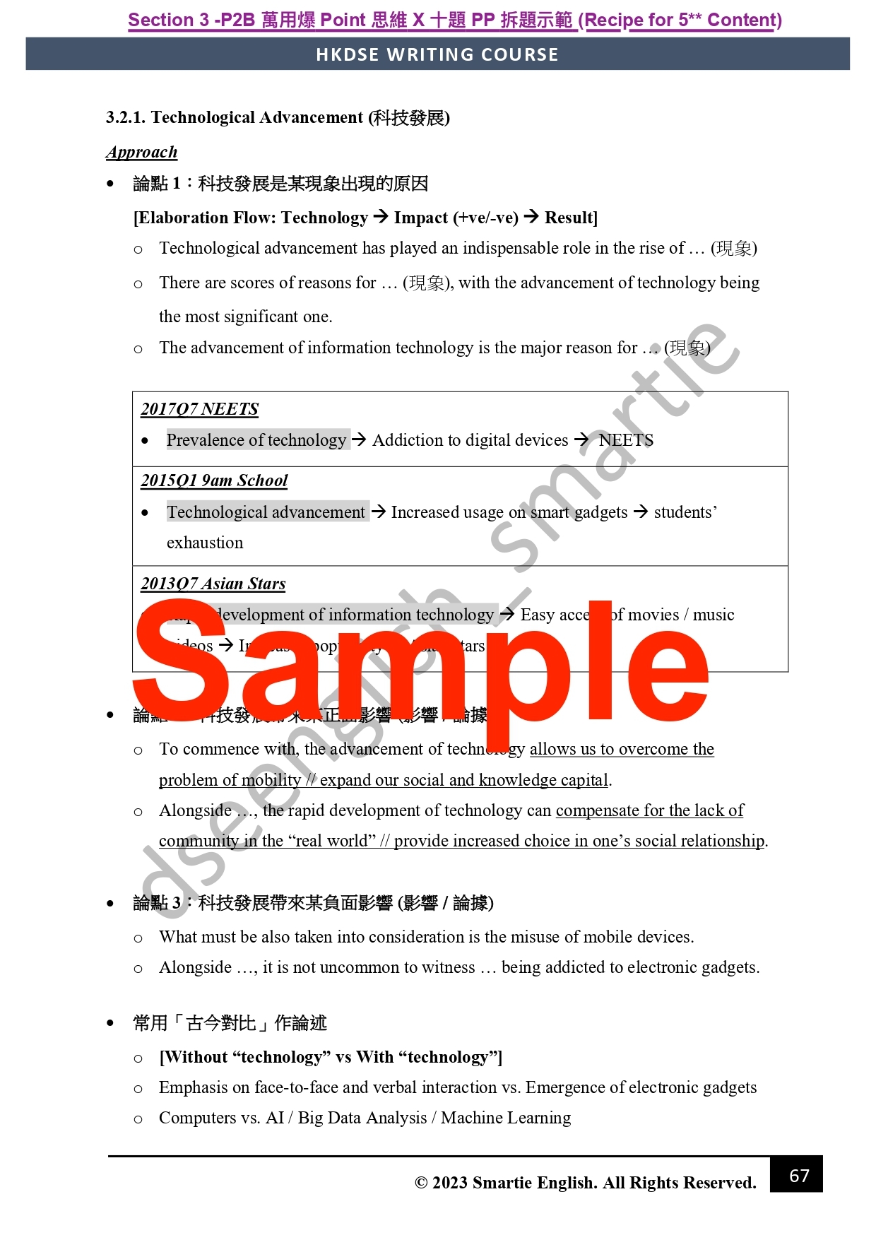 Smartie教學特色之一:「有得背就唔好嘥時間諗」。呢部分會教你七招寫出吸精title、公式化首尾段、萬用主題句及小結句、以及提供奪星必備高階連接詞庫(連中文解釋、例句!) 背定曬七款考評必備元素嘅5**級罐頭句,慳返時間之餘,係最容易嘅部分搶盡印象分!