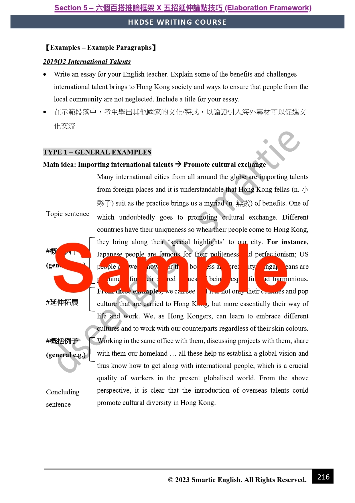 好多同學寫完topic sentence就開始唔知點作落去,呢度將會充分呈現比你睇點樣將elaboration「公式化」。喺呢部分,我會教你六個百搭推論框架,配合五招延伸論點技巧,你會知道做到高階嘅推論比你想象中簡單得多,皇牌筆記更加提供咗合共50個示範段落比你參考,只要上足堂、溫足筆記,你一樣可以輕鬆做好推論。