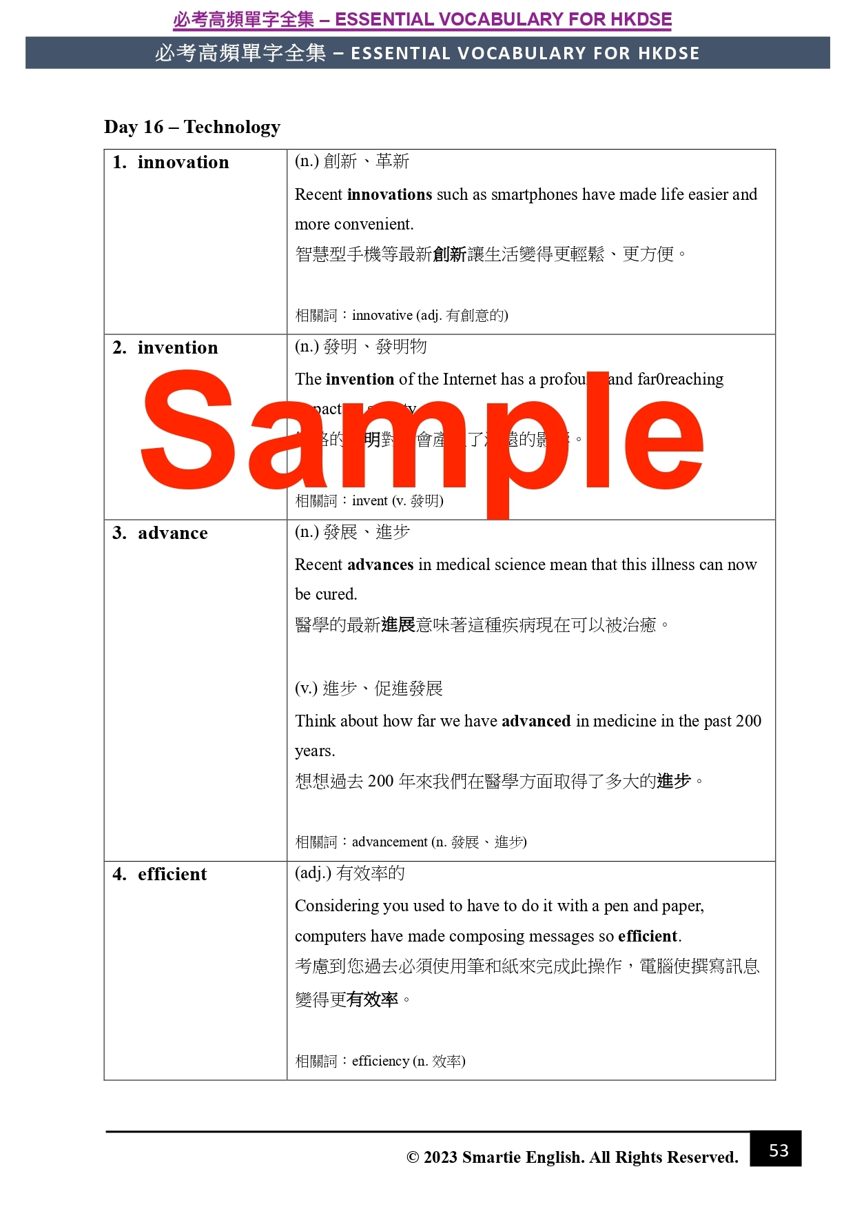 嚴選必考高頻單字:底子差嘅同學經常會遇到嘅問題,就係詞彙量不足。單字筆記收納咗375個熱門生字,幫助同學係三十日內打好根基,掌握卷一/二/三/四都常用、常出現嘅詞彙。筆記入面每個詞語都附上中文解釋、中英對照例句,以及同/反義詞、相關詞,幫助同學全面學識運用生字嘅技巧特別提升寫作能力。