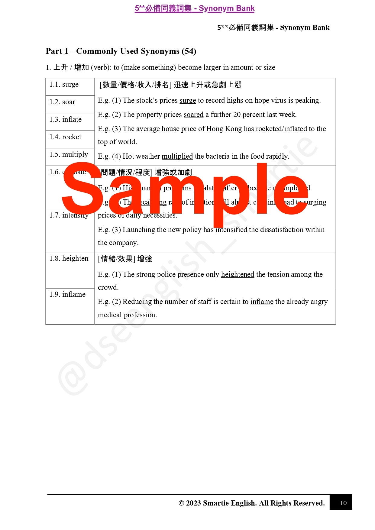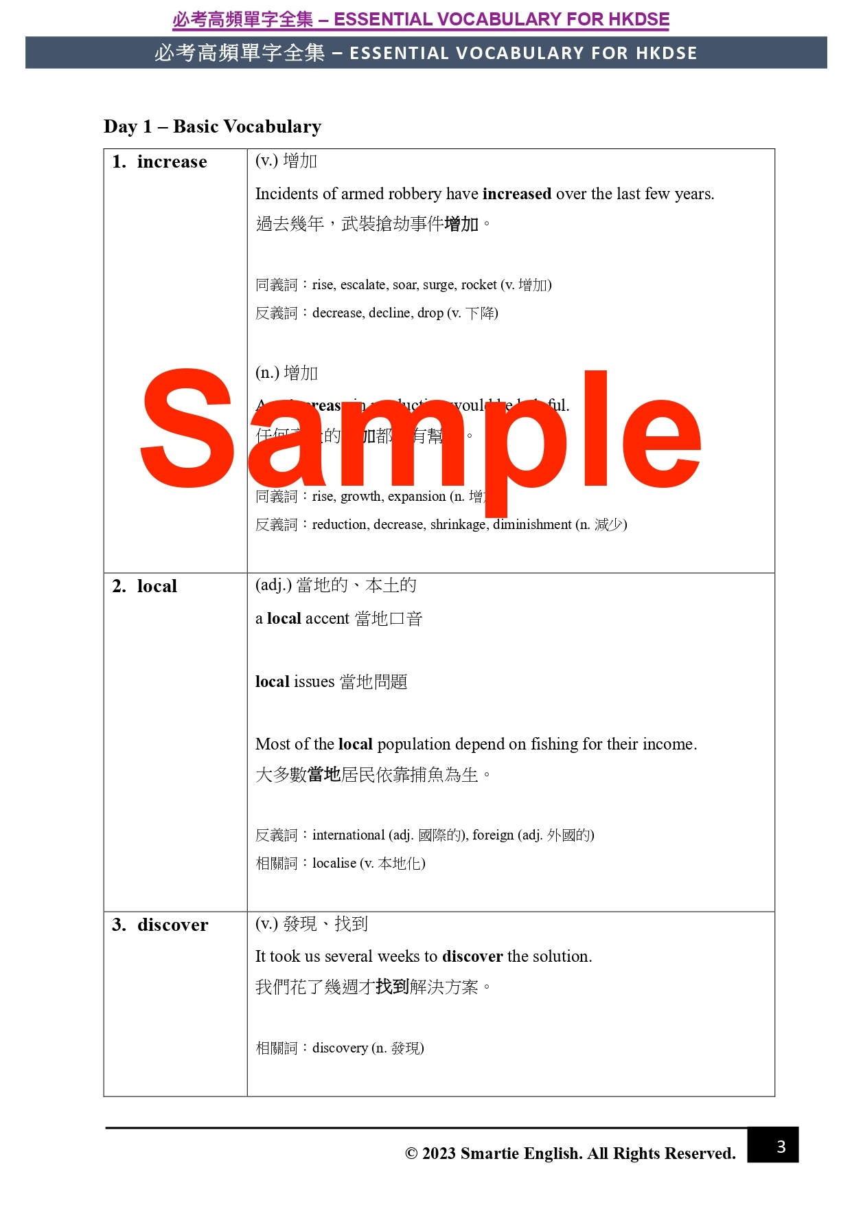 嚴選必考高頻單字:底子差嘅同學經常會遇到嘅問題,就係詞彙量不足。單字筆記收納咗375個熱門生字,幫助同學係三十日內打好根基,掌握卷一/二/三/四都常用、常出現嘅詞彙。筆記入面每個詞語都附上中文解釋、中英對照例句,以及同/反義詞、相關詞,幫助同學全面學識運用生字嘅技巧特別提升寫作能力。