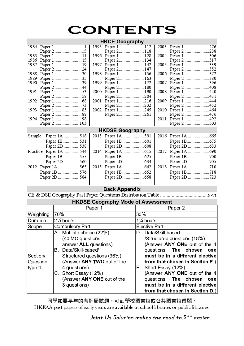 本書並無收錄試題。近年的試題可於考評局購買,早年的試題則可於學校圖書館或公共圖書館借閱。