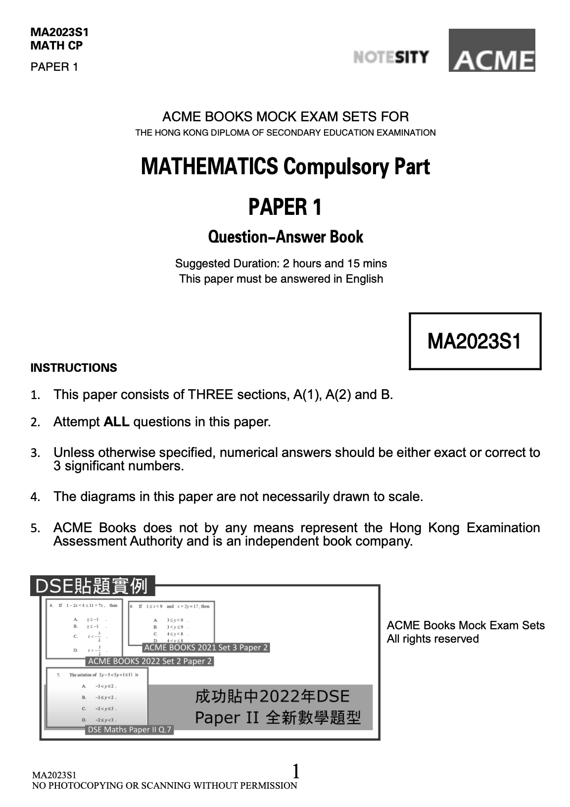 ACME Books DSE Maths Mock Paper Set 收錄一整套 Paper 1、2 題目、Suggested Solution 及 Paper 2 (MC) 詳解,助你全面應對DSE考試!