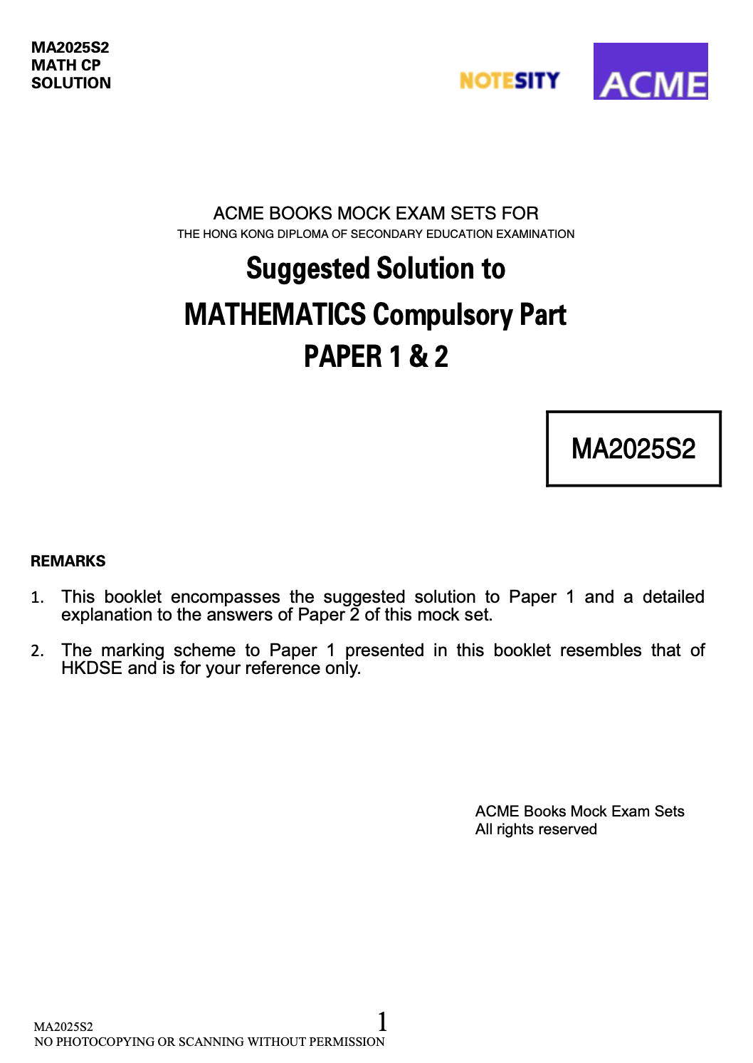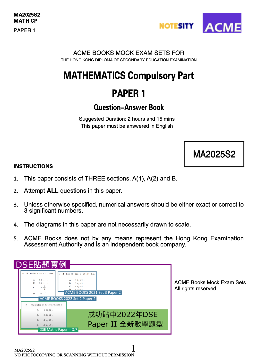 ACME Books DSE Maths Mock Paper Set 收錄一整套 Paper 1、2 題目、Suggested Solution 及 Paper 2 (MC) 詳解,助你全面應對DSE考試!