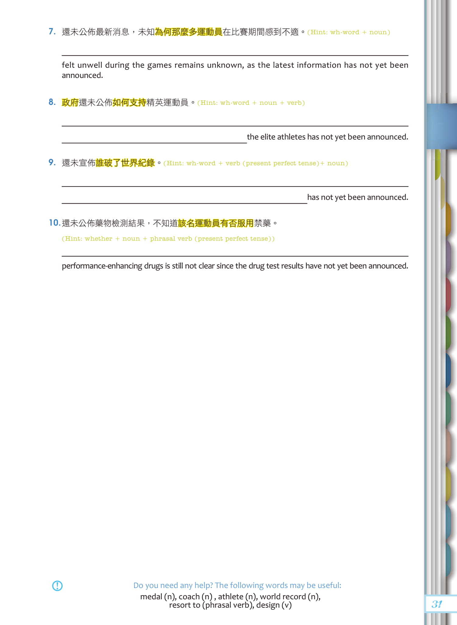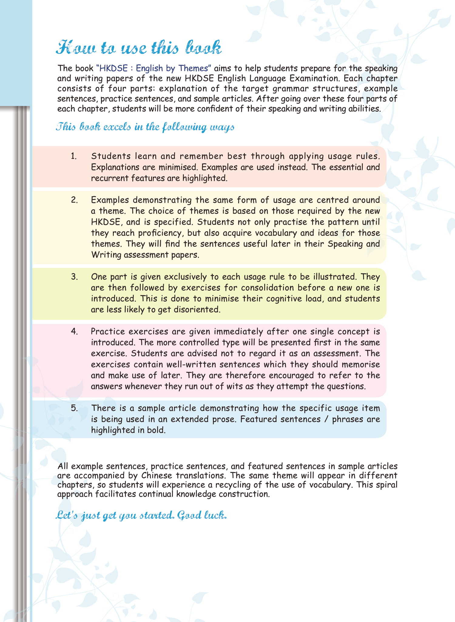 - Chinese translation to featured sentences in examples, practice exercises and sample articles