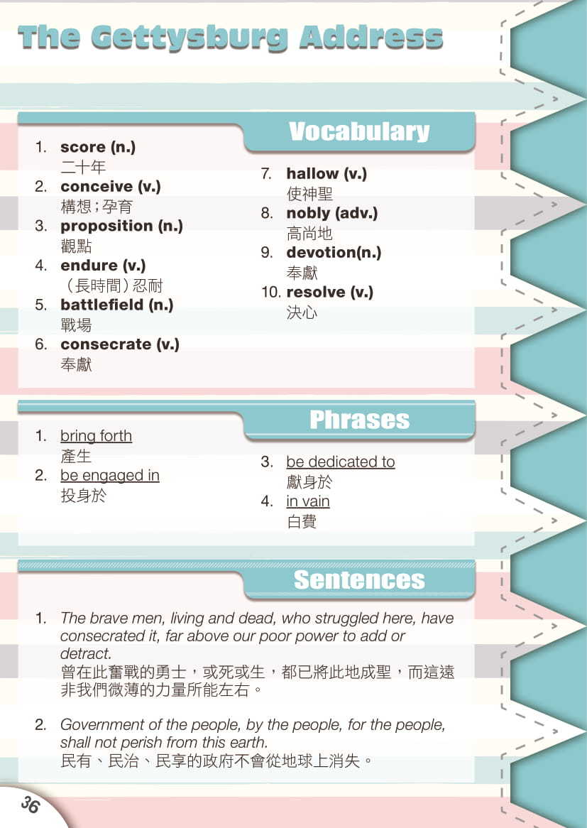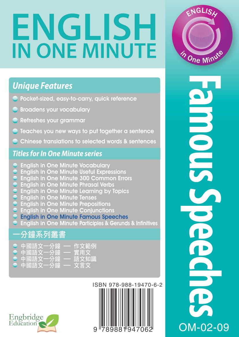 - 精選短語及句子附有中文翻譯,書中亦提供背景資料,有助理解講辭含意