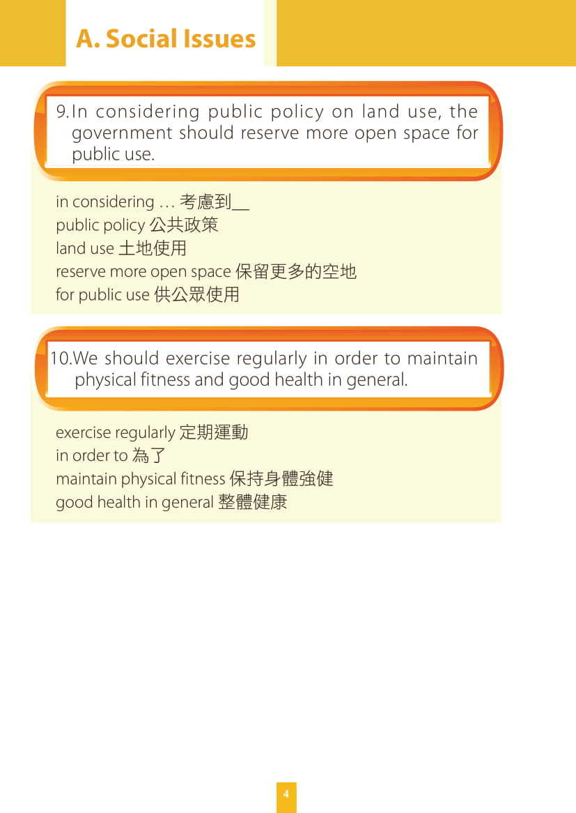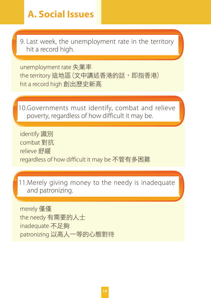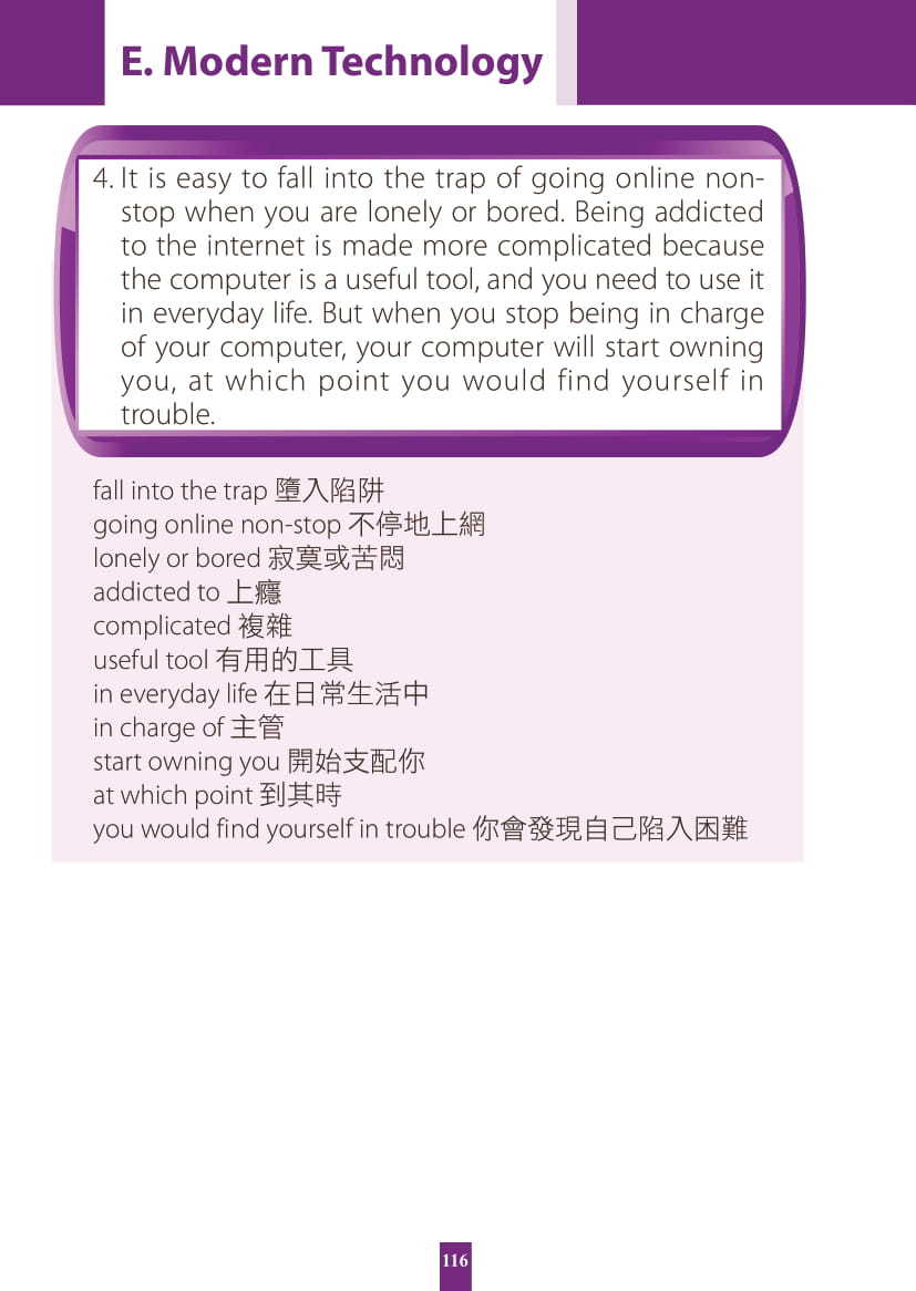 - 按主題劃分為6章,包括「社會議題」(Social Issues)、「大眾傳媒與藝術」(Mass Media and Arts) 、「香港、中國與世界」(Hong Kong, China and World)、「日常生活」(Daily Life)、「現代科技」(Modern Technology) 及「環境與生態」(Environment and Ecology)