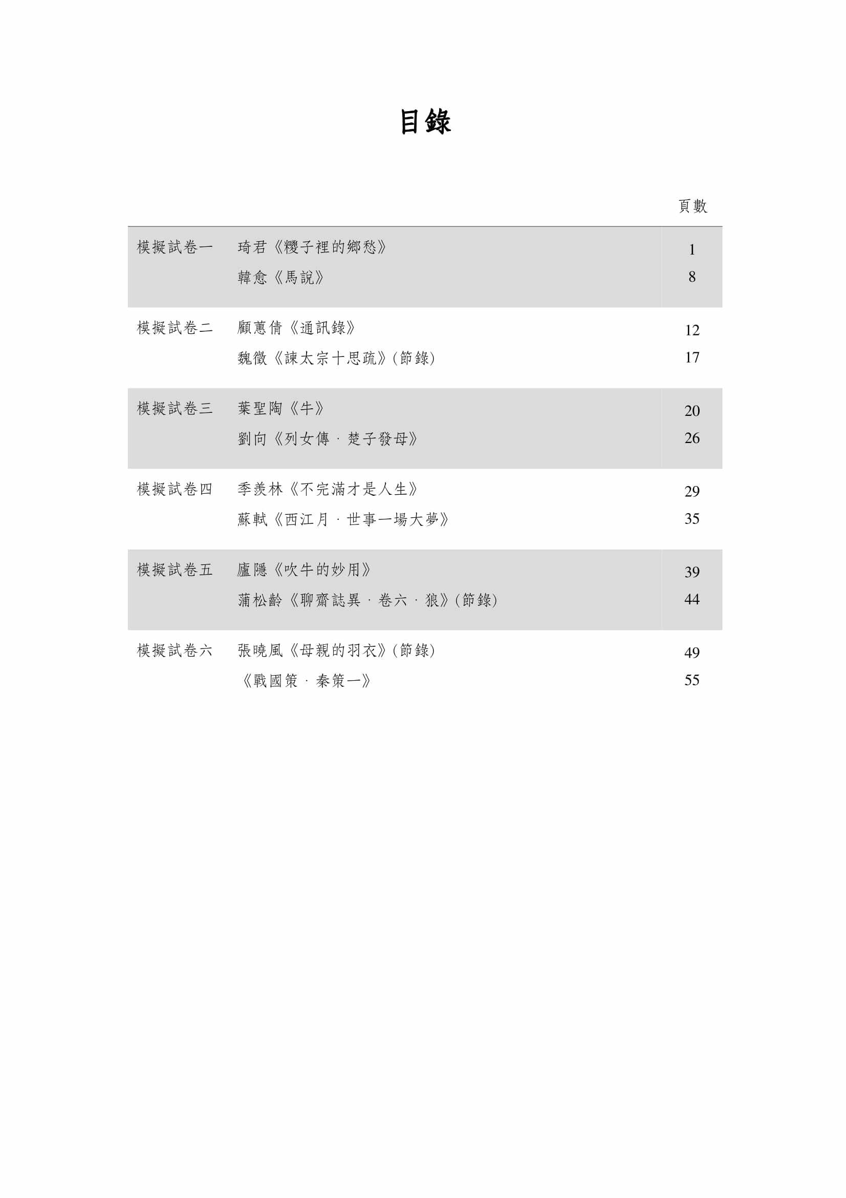 - 題型廣泛,包括表格題、多項選擇題、三式判斷題、段落大意題、象徵比喻題、改寫題、跨篇章比較題、語譯題、手法題等,訓練同學應試技巧。