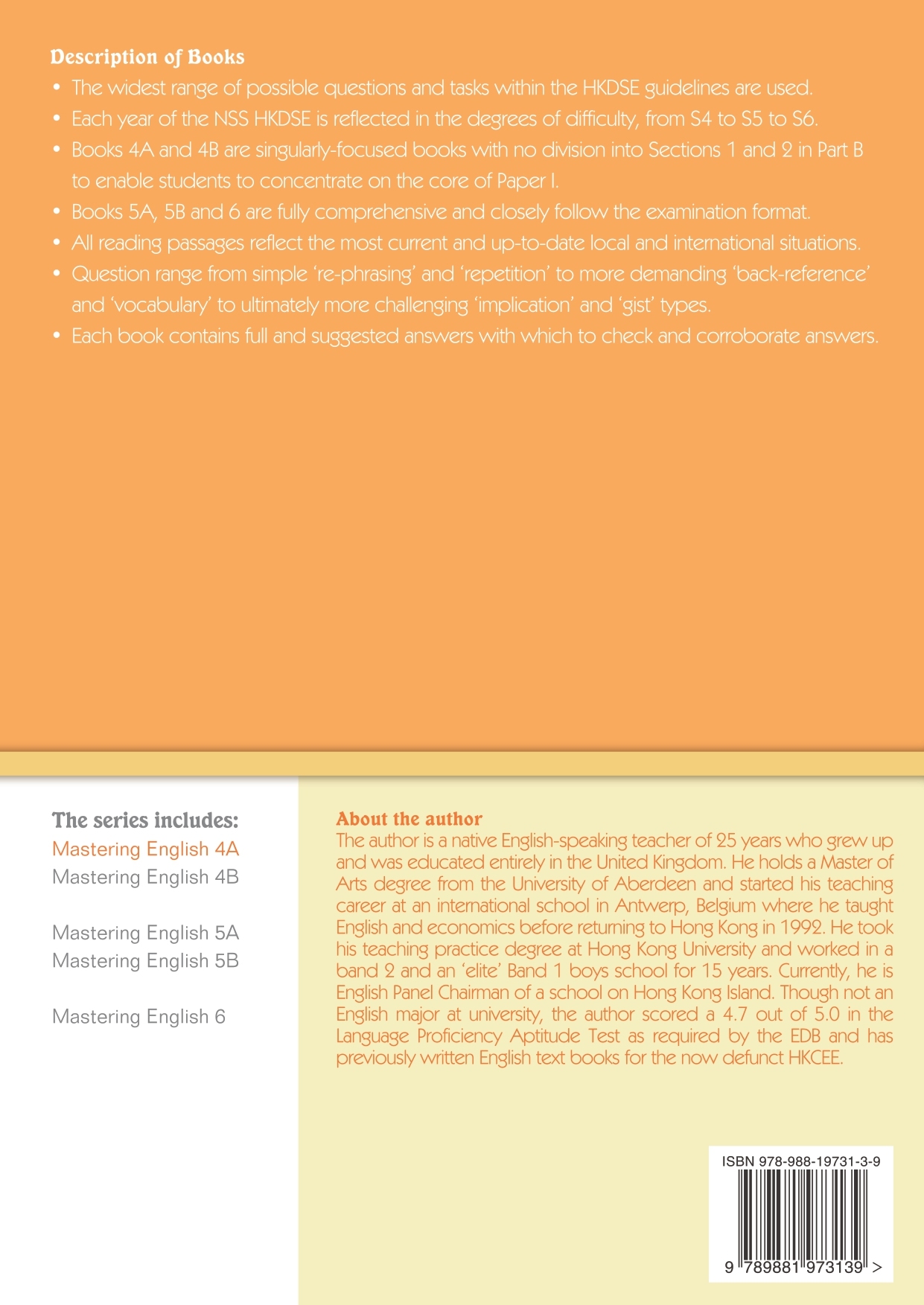 • Though not an English major at university, the author scored 4.7 out of 5.0 in the Language Proficiency Aptitude Test as required by the EDB and has previously written English text books for the now defunct HKCEE as well as his most recent books, the Mastering English Series and Common Errors in English Series. He is now retired and writes professionally.