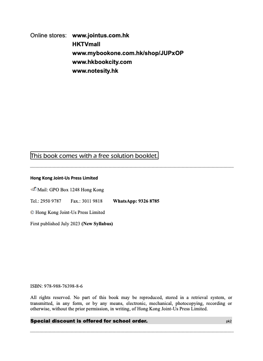 Addressing the question styles widely adopted nowadays, real-life applications and DSE type questions are included. Students should then have a better understanding of each topic and thus, be at a better position to master and apply what they have learnt. We are confident that students’ performance in tackling problems encountered during examinations should be greatly enhanced.