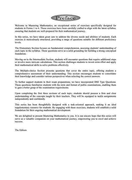 Mastering Mathematics is a series of exercises specially tailored for F.1 to F.6 students.