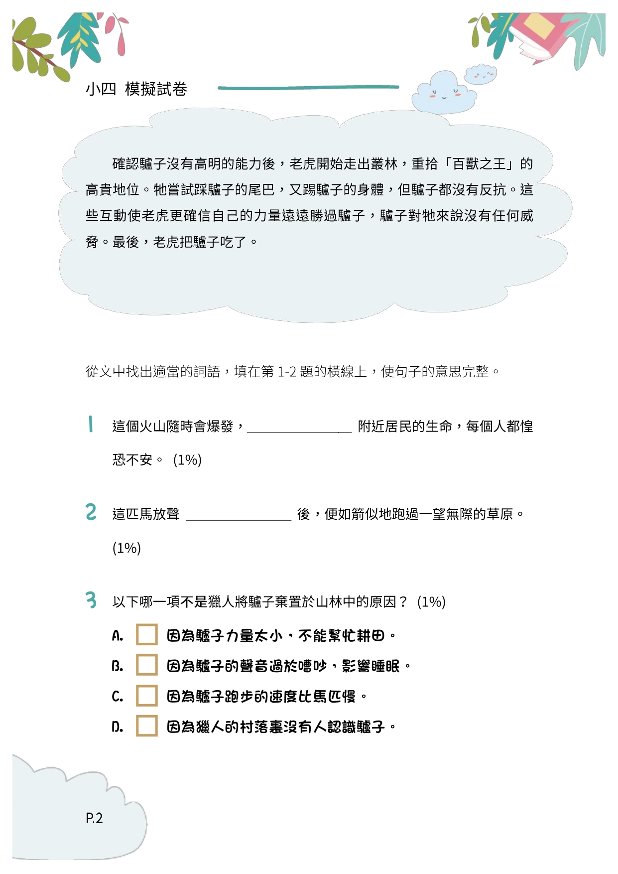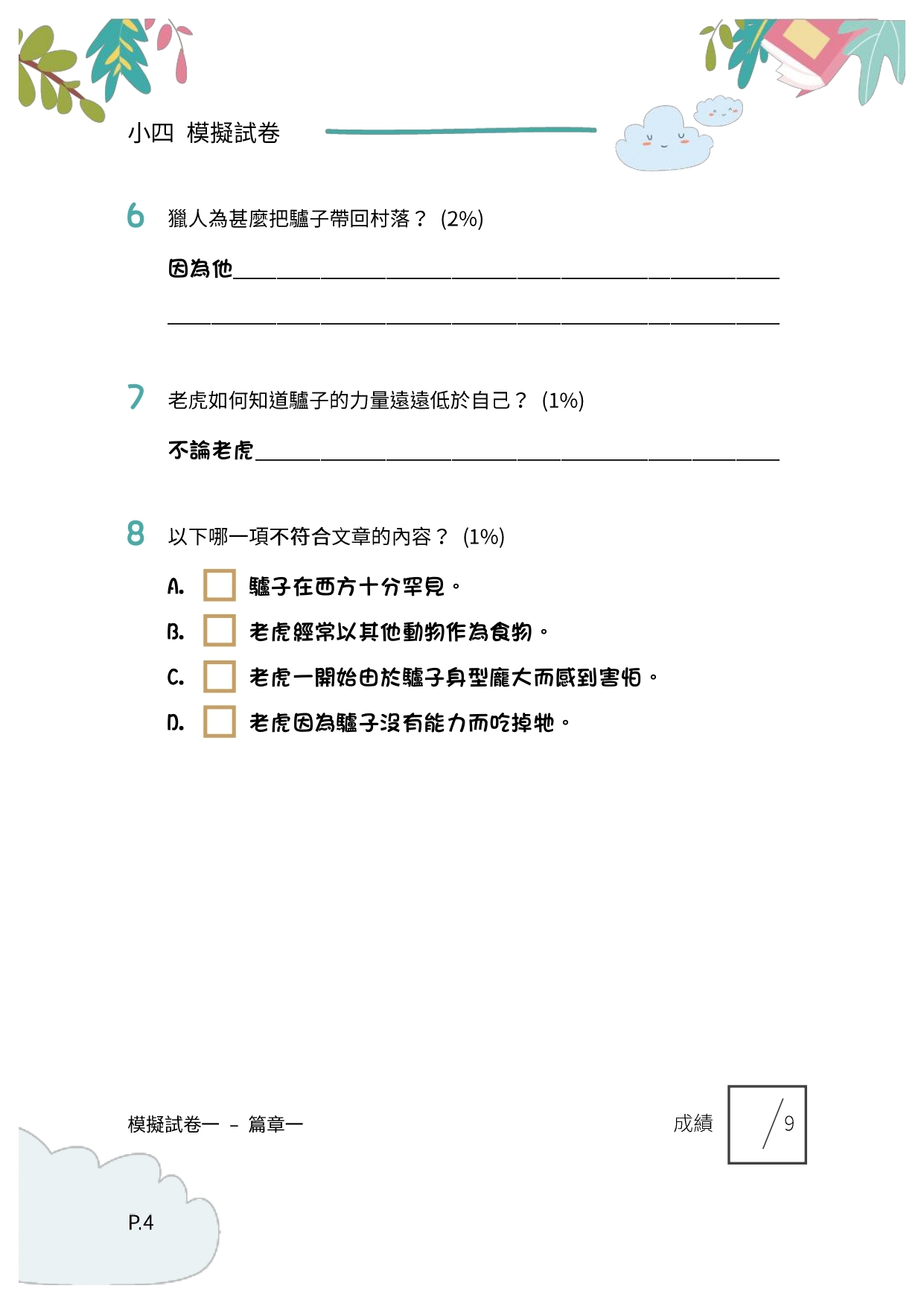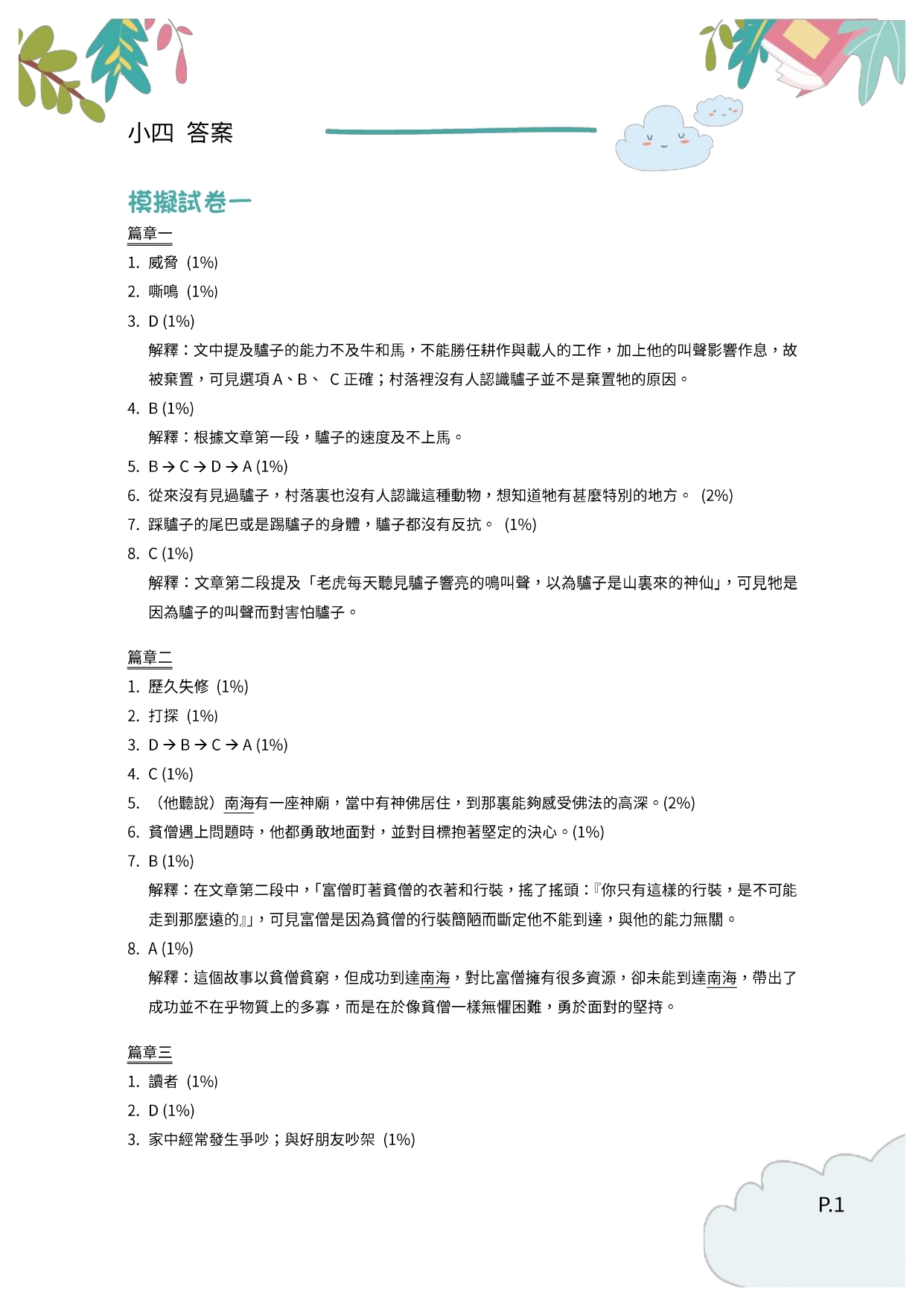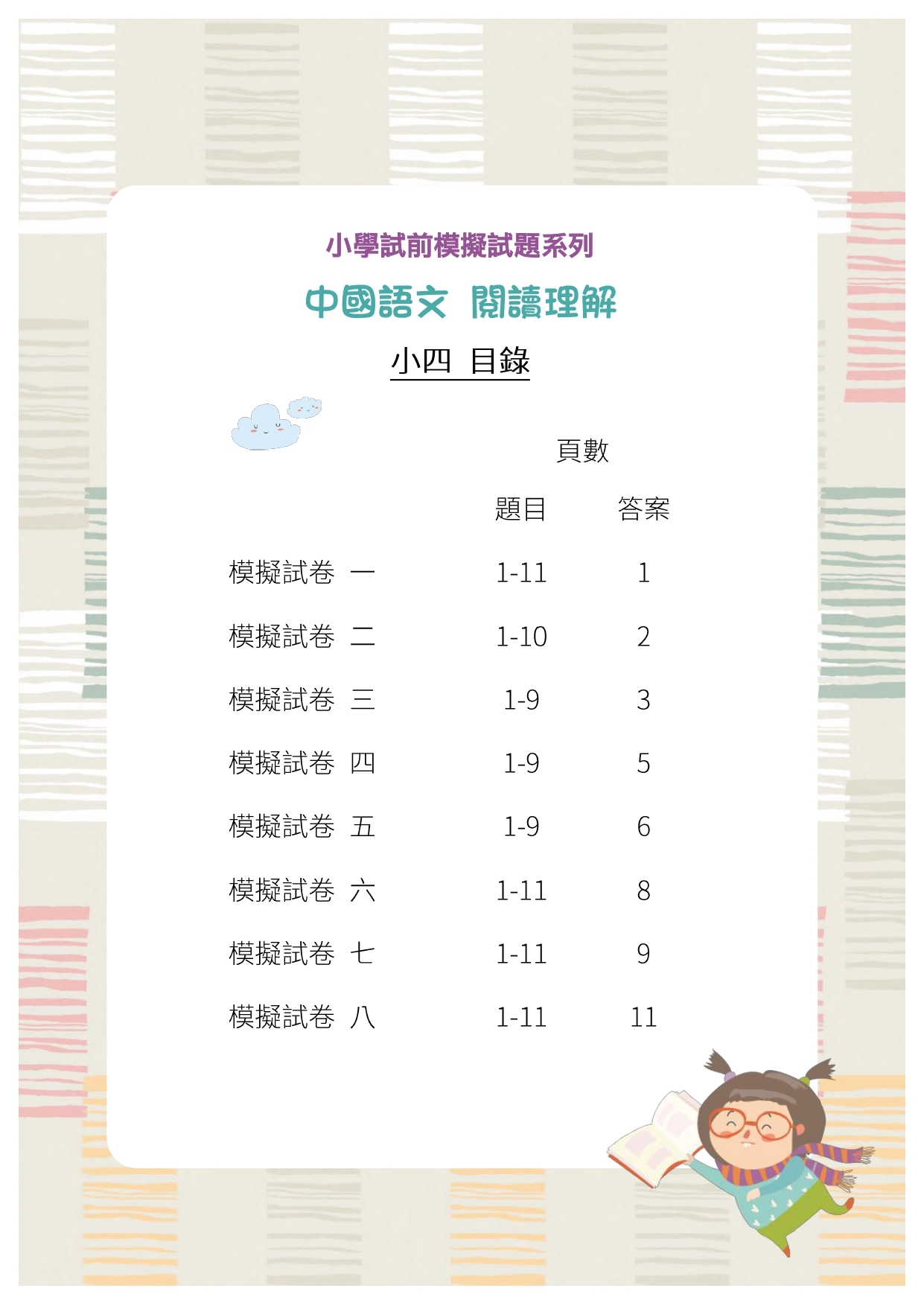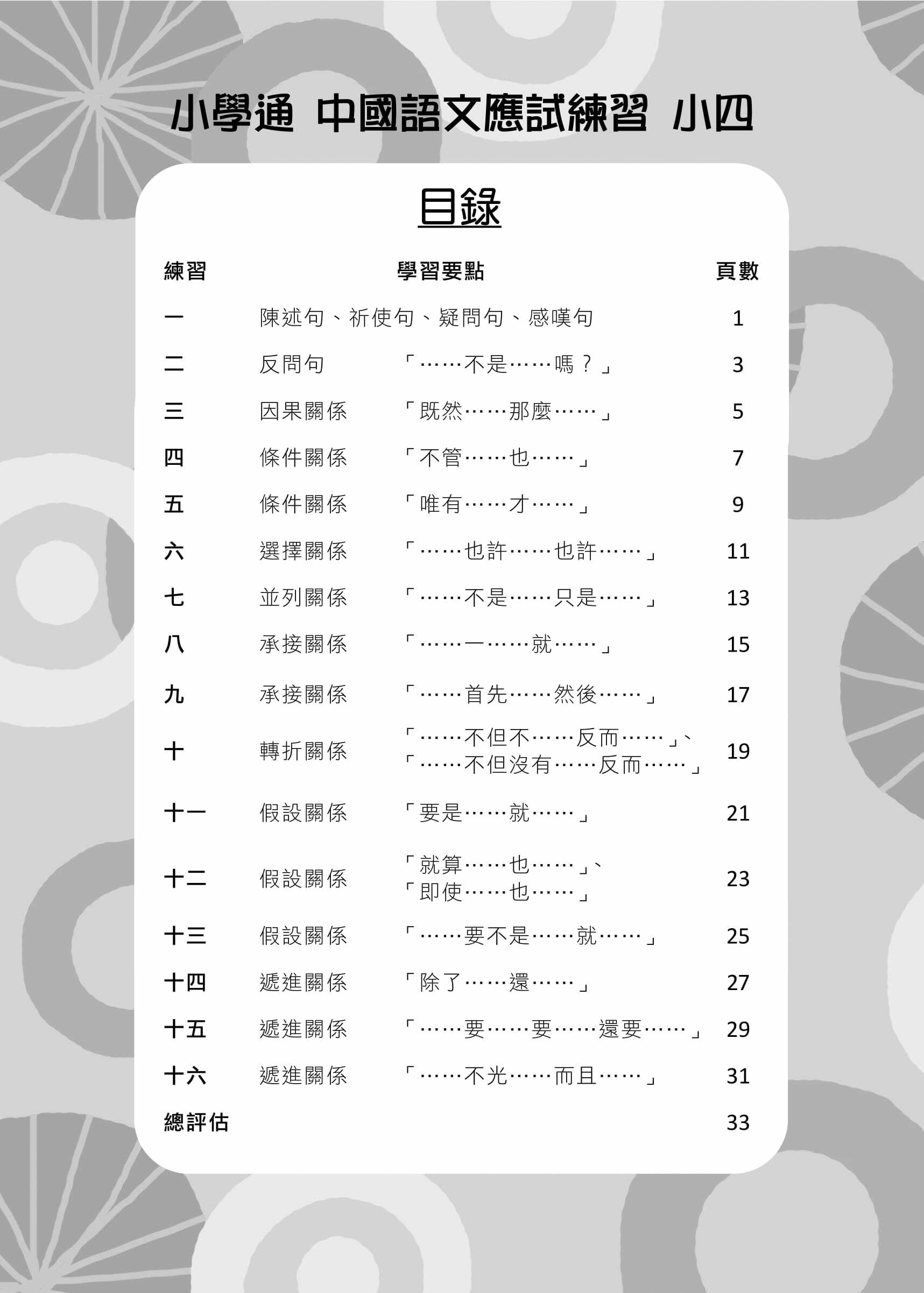 本練習參照全港性系統評估 (TSA) 與中一入學前香港學科測驗 ( PS1) 的題目類型,每份練習均包括填充題、短答題、多項選擇題等不同題型,考核內容更包括寫作手法、修辭技巧、段落大意、內容理解、文章格式等,有助學生了解各種題型的回答方法,並重溫各種語言知識。另外,本練習亦涵蓋不同文體,包括記敘文、論說文、抒情文,以及不同類型的實用文,讓學生在理解各種文體時更為得心應手,對於提升學業成績甚有裨益。