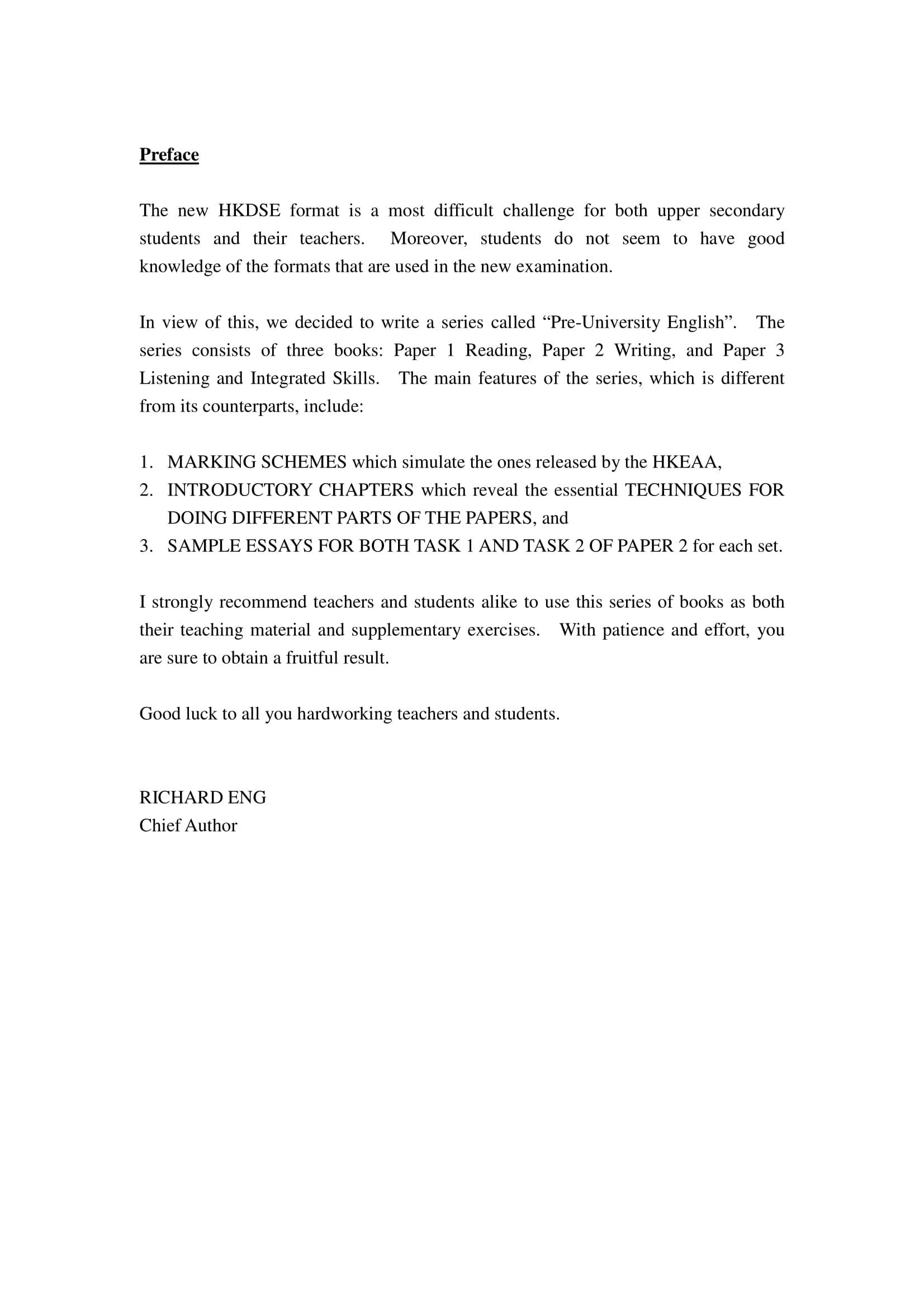 - 香港中學文憑試的全新考試模式對高中生及其教師而言皆為一大挑戰,加上部分同學似乎對文憑試的考試模式不甚了解,有見及此,作者遂編寫了「Pre-University English」系列書籍。此系列包括冊:卷一閱讀、卷二寫作、卷三聆聽及綜合能力及卷四說話能力。此系列與其他參考書的不同之處包括: