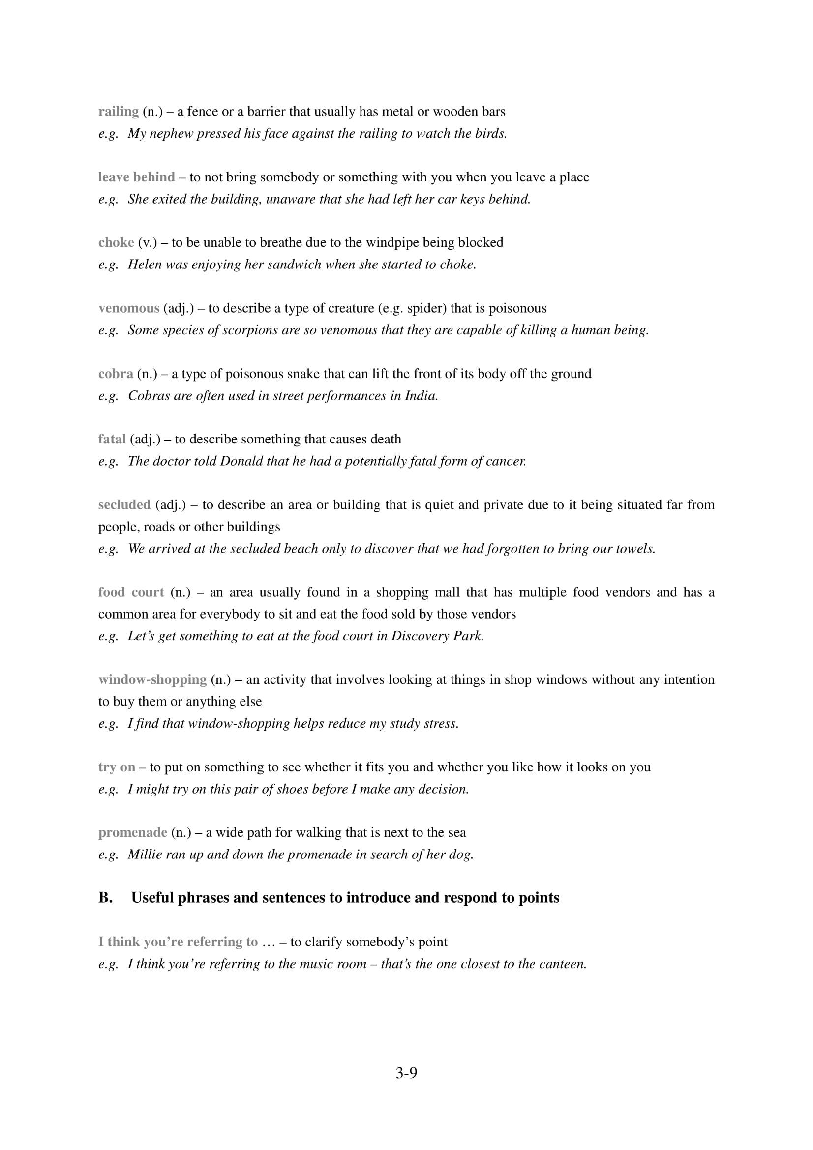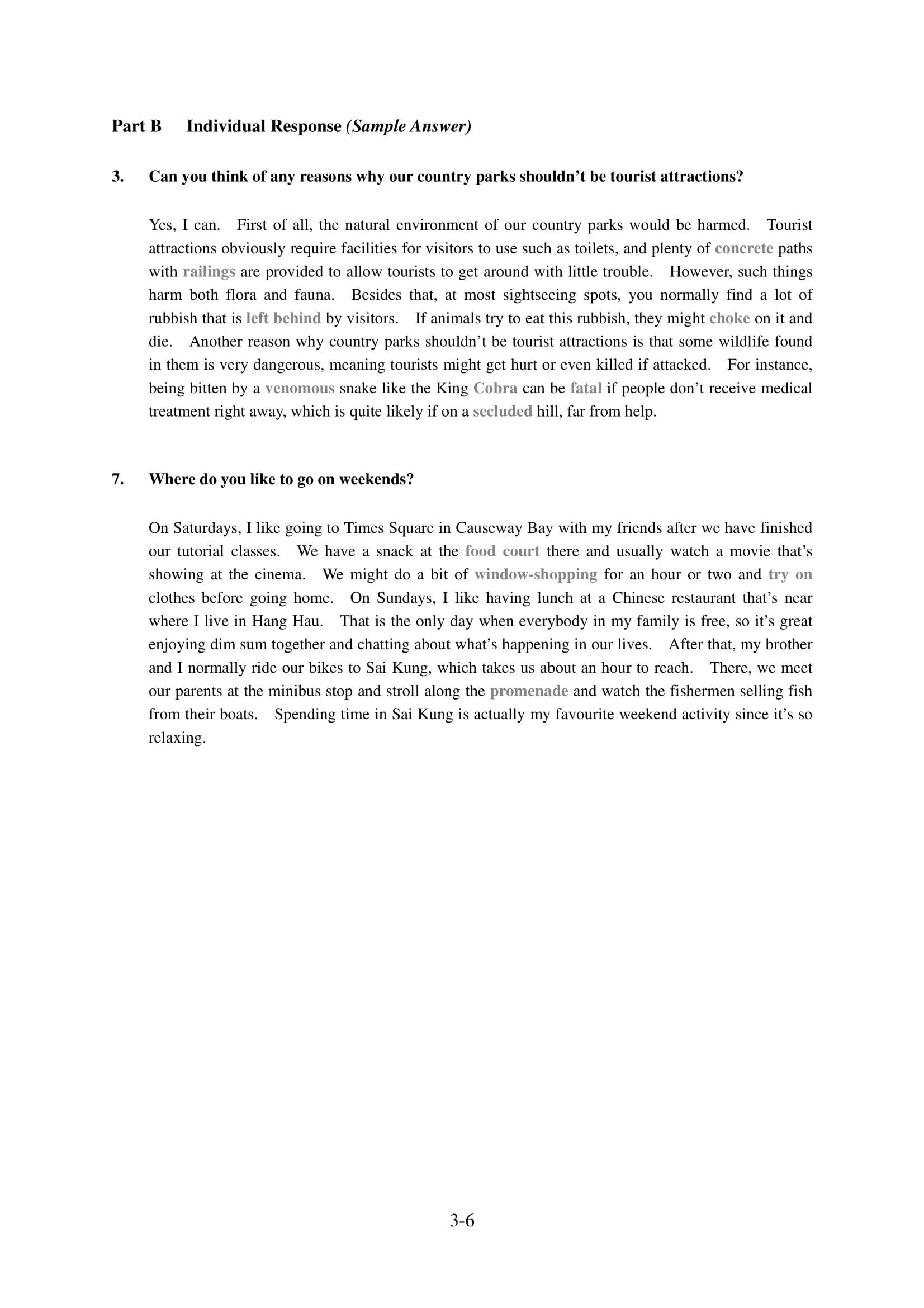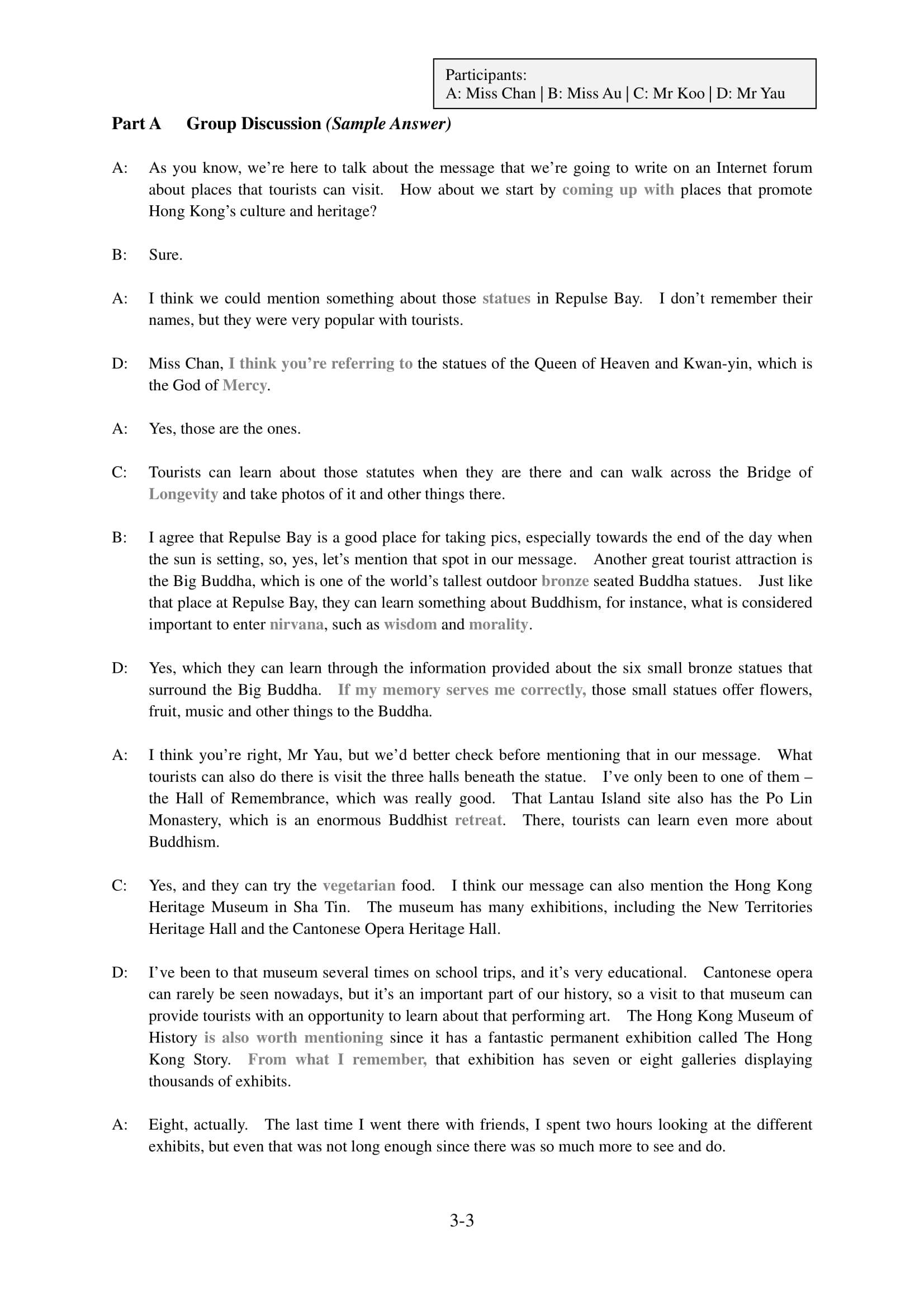 ◊ 4. MOCK DISCUSSIONS for each set of the Speaking paper, including USEFUL VOCABULARY AND PHRASES for easy reference and revision. SUGGESTED ANSWERS to selected Individual Response questions are also provided.