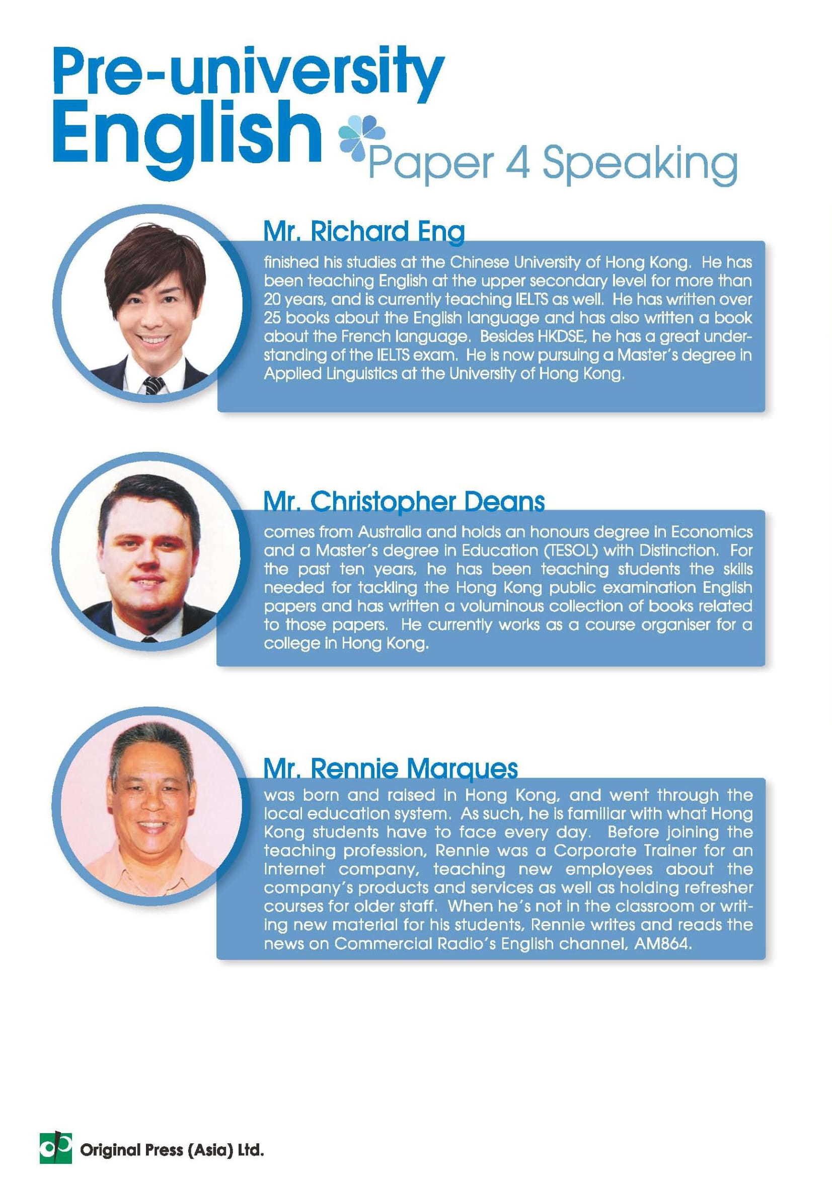- In view of this, the authors decided to write a series called "Pre-University English". The series consists of Paper 1 Reading, Paper 2 Writing, Paper 3 Listening & Integrated Skills, and Paper 4 Speaking. The main features of the series, which is different from its counterparts, include: