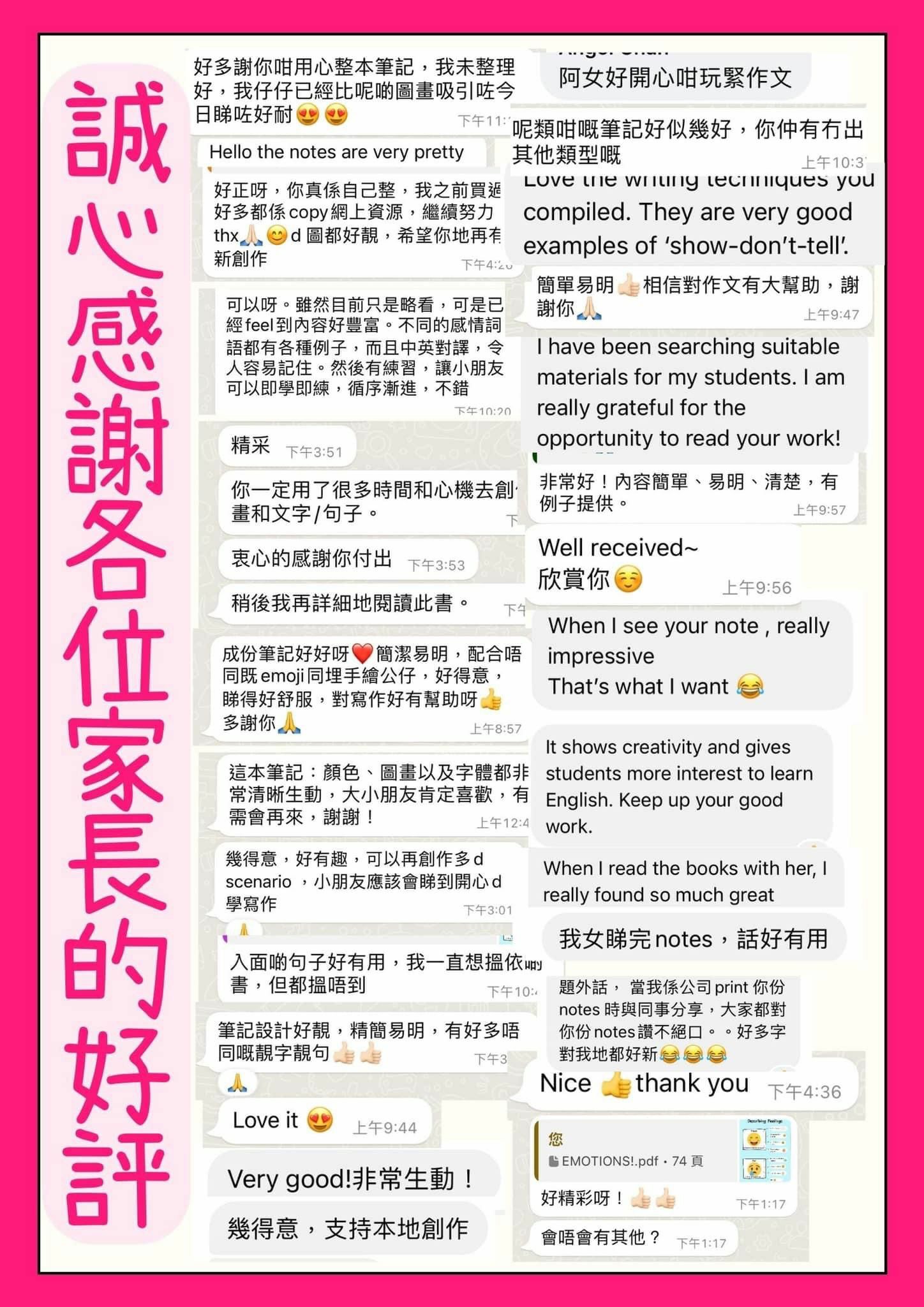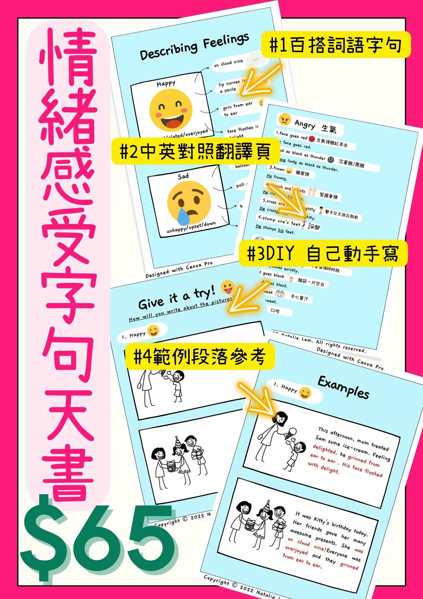 想知道英文考試的4格漫畫題怎樣寫得好?格內主角「樂翻天」😆、「慌張」😖、「愁眉苦臉」😔、「面紅耳赤」😡、「嚇一嚇」😱 、「黑面」👺等的感受和肢體動作,應該怎樣表達?這一本小天書保證可以教懂大家,助各位小朋友考試衝衝分!