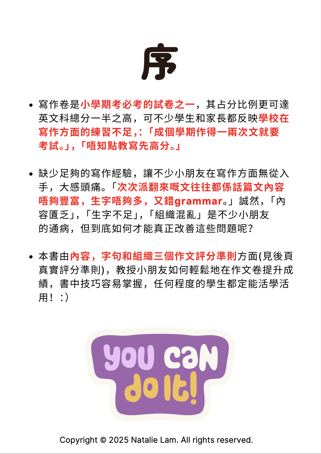 教小朋友如何由「內容」、「文句」、「組織」三方面取分嘅作文天書可以幫到你!